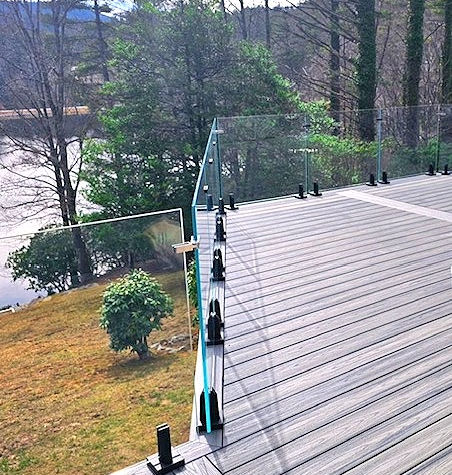 LAKE OVERLOOK DECK BUILD FEATURING TREX TRANSCEND DECKING IN ISLAND MIST. COMPLIMENTED WITH VIEWRAIL GLASS RAILINGS AND TALON SPIGOTS.